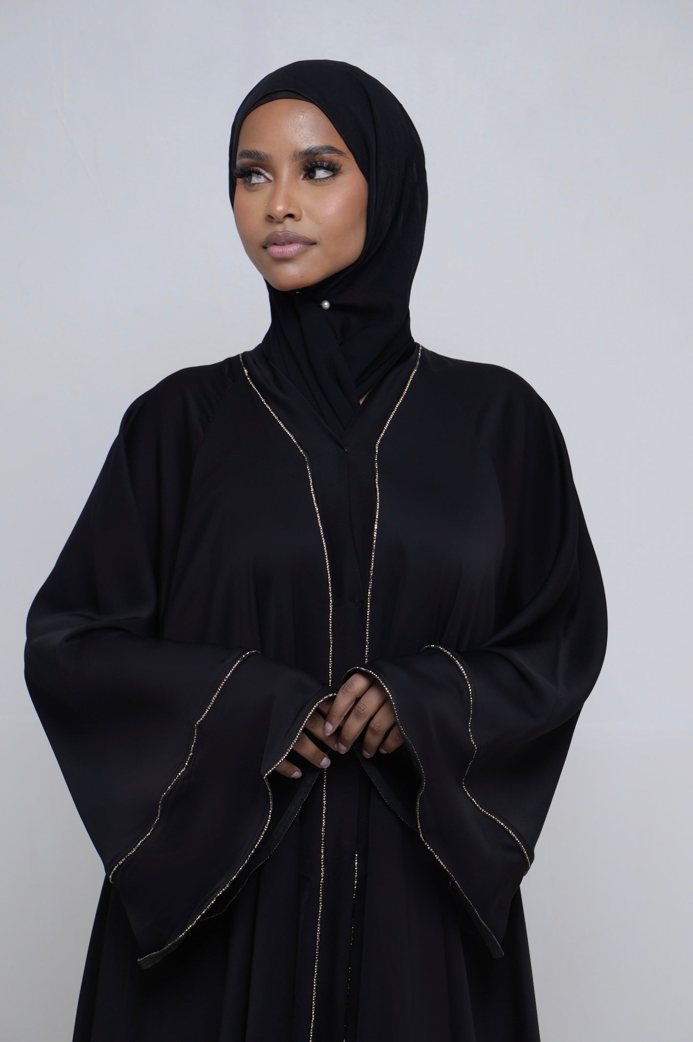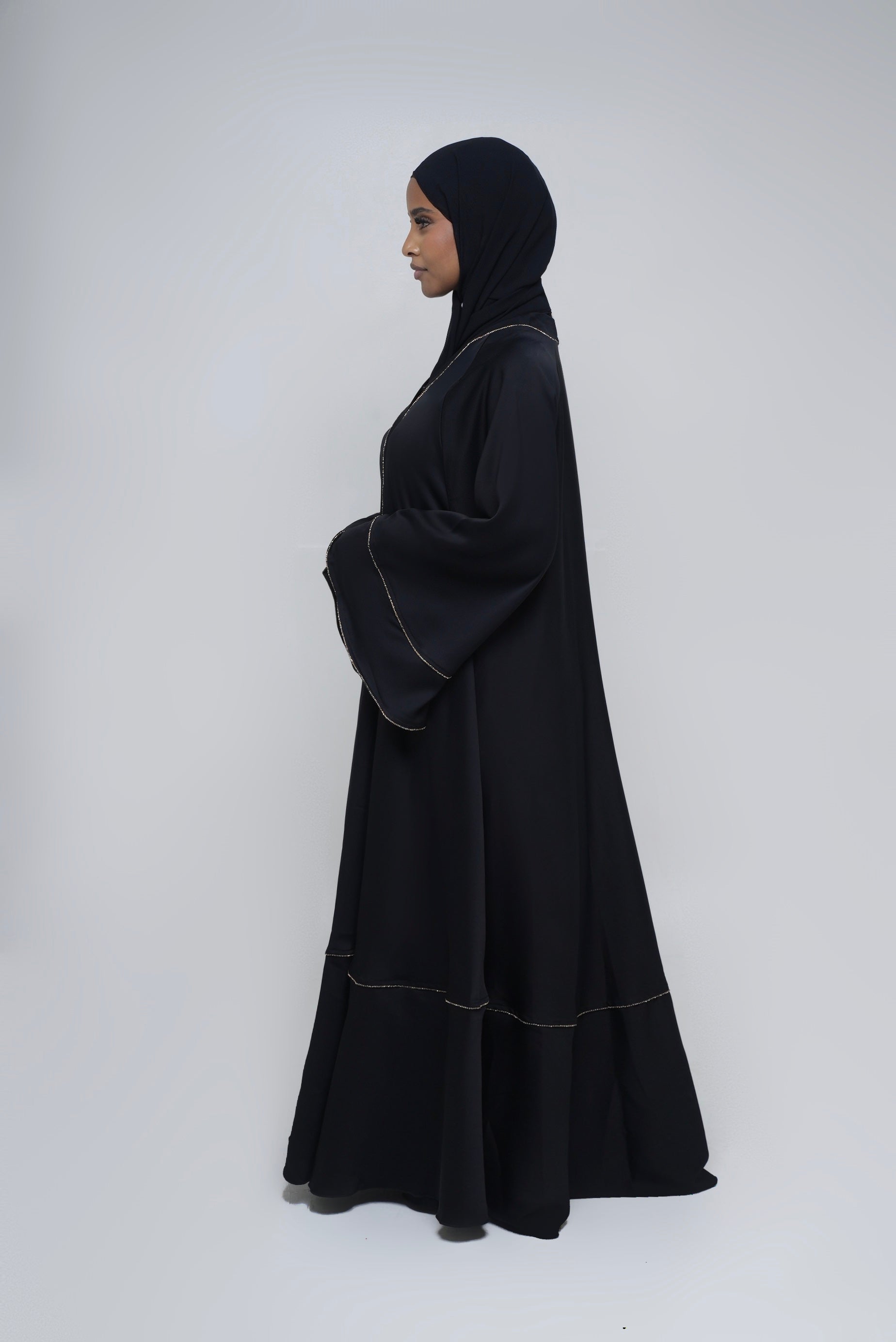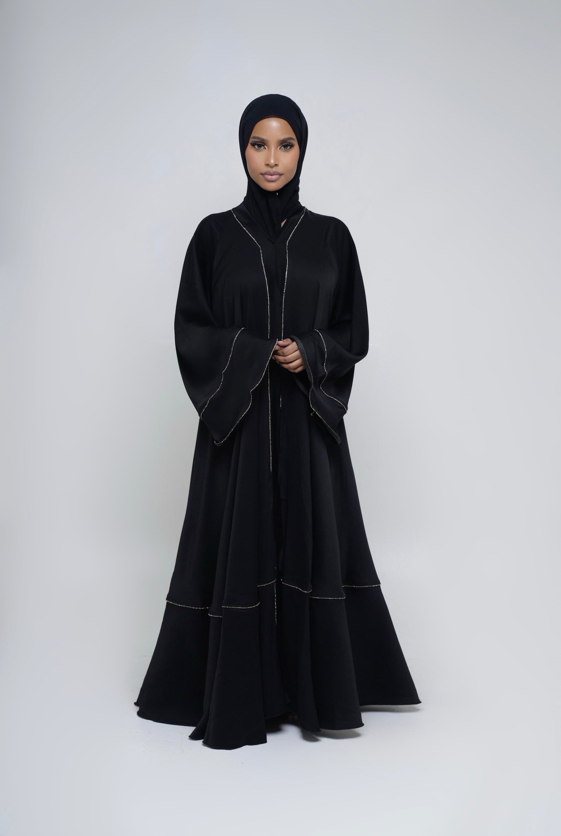 Des détails de strass linéaires et subtils décorent le kimono avec délicatesse, ajoutant un éclat discret sans surcharger le modèle. L’ensemble est complété par un hijab et une ceinture assortis, permettant d’adapter le porté selon vos envies.